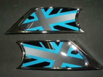 R56:55:57:58:59用 ユニオンジャックデザインのサイドベントカバーインサート。 純正のサイドベントを分解しての交換となります。 別売りのキャリヤセットが必要な場合もございますので、良くわからない場合はお問い合わせください。